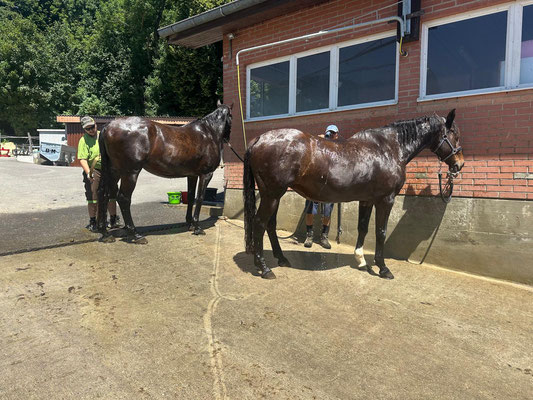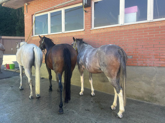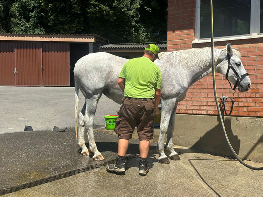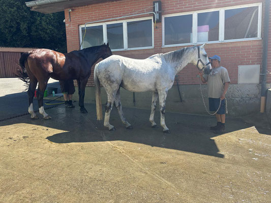 Duschtag für alle Pferde, sie geniessen es in dieser Hitze. Mit Essigwasser wird nachgespült.